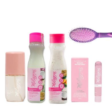 El Kit Milagros Reparación Intensiva es la rutina perfecta para devolverle la vida, brillo y suavidad a tu cabello. Su fórmula está diseñada para nutrir profundamente, reparar el daño y dejar tu melena más fuerte y saludable desde la primera aplicación. Incluye un shampoo reparador que limpia sin resecar, un acondicionador nutritivo que hidrata y desenreda al instante, una ampolleta de reparación profunda que fortalece la fibra capilar y sella puntas abiertas, un perfume capilar que deja un aroma delicioso mientras protege del frizz, y un cepillo desenredante que evita el quiebre y mantiene el cabello suave y manejable.