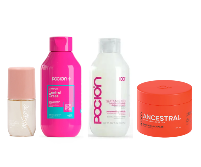 Devuélvele la vida a tu cabello con este kit diseñado para reparar, nutrir y revitalizar desde la raíz hasta las puntas. Incluye Shampoo la Poción, que limpia y fortalece; Tratamiento la Poción, que restaura la fibra capilar; Mascarilla ancestral, que aporta brillo y suavidad natural; y Perfume Capilar Milagros, que deja un aroma fresco y duradero.