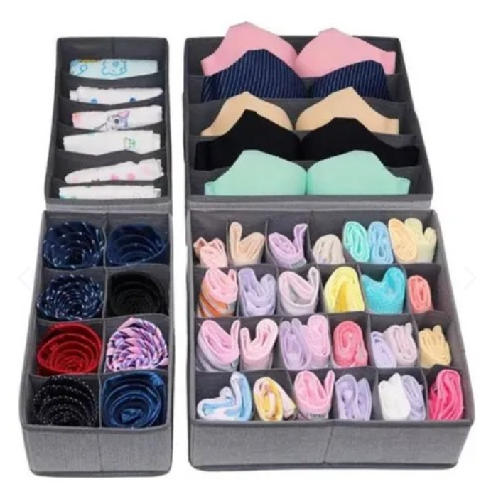 Este Organizador De Ropa Interior Y Medias Divisor Cajones Set X4 te permite guardar tu ropa interior, calcetines, corbatas, entre otros de manera rápida y organizada. Es ideal para organizar tus cajones o armarios de una manera más eficiente. Está fabricado con un material tejido en malla de nailon para mantener tu ropa fresca y sin olores.